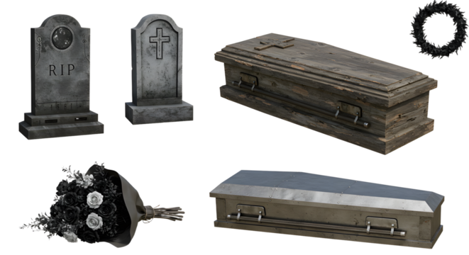 A somber collection of gravestones and coffins, surrounded by a black flower bouquet, set against a neutral background