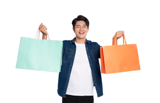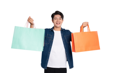 A beautiful caucasian girlfriend or a happy female customer with shopping bags buying gifts at a mall or retail store on Black Friday discounts, sales deals isolated on a png background.