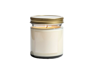 A lit candle in a glass jar, gold lid, blank label, isolated on black