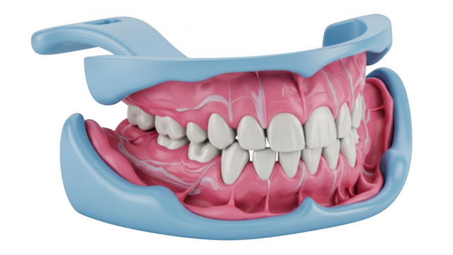 Dental mouth gag with white teeth and pink gums on black oral hygiene