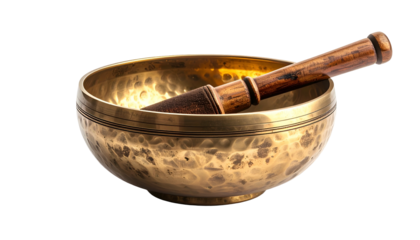 Close-up of a golden singing bowl with wooden striker, isolated on a black background