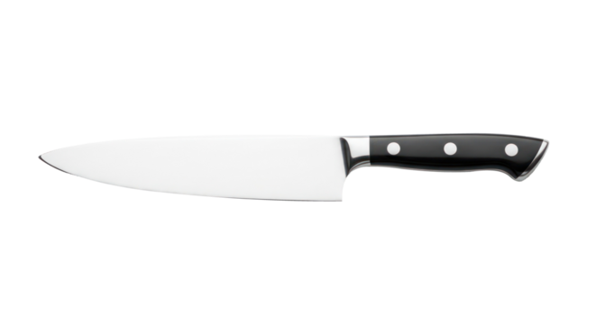 A stainless steel chef knife with a black handle on a isolated on transparent background