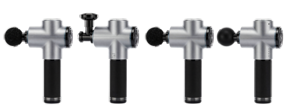 Photograph of five identical gray and black T-shaped valves in a row, each with a different black handle design.