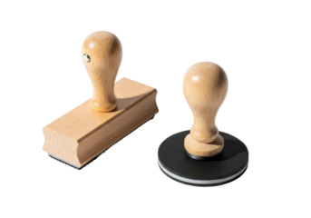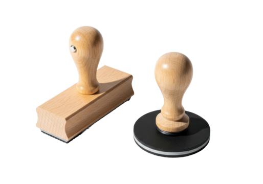 Two traditional wooden rubber stamps, one rectangular, one round, with light natural wood handles and matte black rubber pads, on a transparent background with strong shadows, high-angle