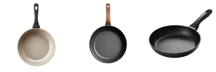 Three different frying pans with black and wood handles  isolated on a transparent background
