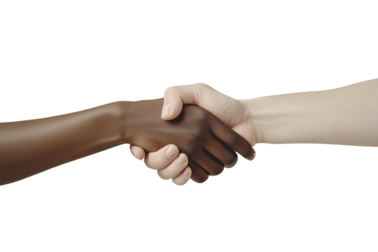 A handshake between a Black man and a White woman, isolated on a transparent background.