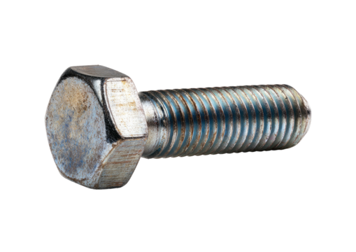 Metal bolt with hexagonal head and threads, seen against a black background