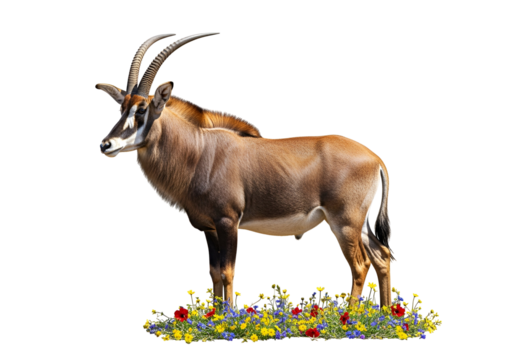 A bull icon surrounded by a green circle and blue flowers on transparent background