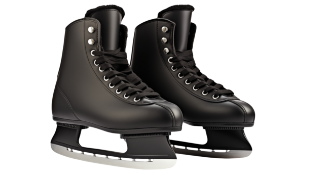 Pair of black textured high heel boots isolated on transparent background. Black ice hockey skates isolated on white background.