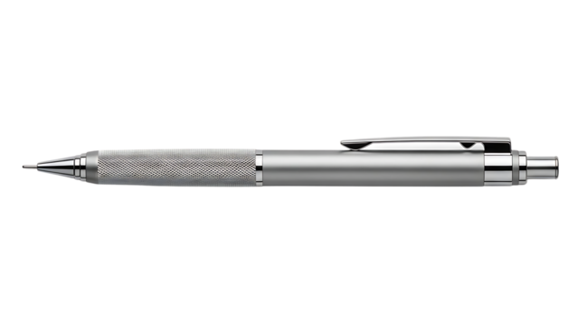 A professional close-up of a silver ballpoint pen and fountain pen isolated on white paper, featuring sleek metal design and black ink for business writing and office work