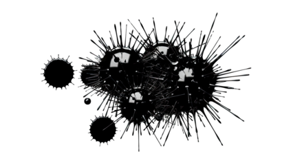 Abstract black ink splatter on a transparent background, creating a dynamic and chaotic pattern of drops and splashes, isolated on transparent background