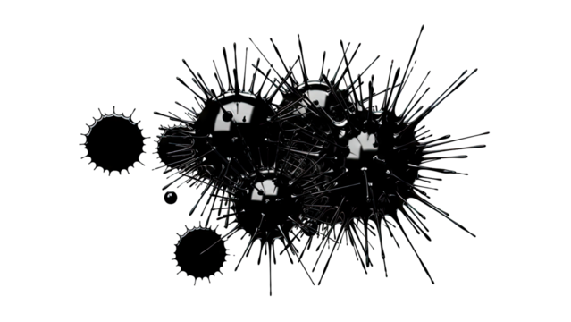 Black ink splashing on transparent background, spatter, splatter, blot, stain, messy