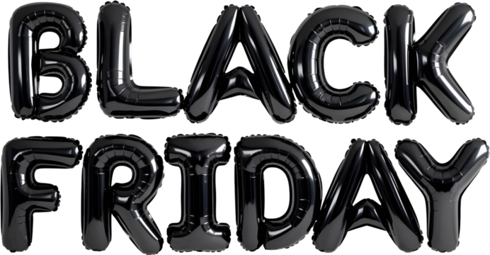 large black shiny balloons arranged to spell 'BLACK FRIDAY' isolate on transparency background PNG