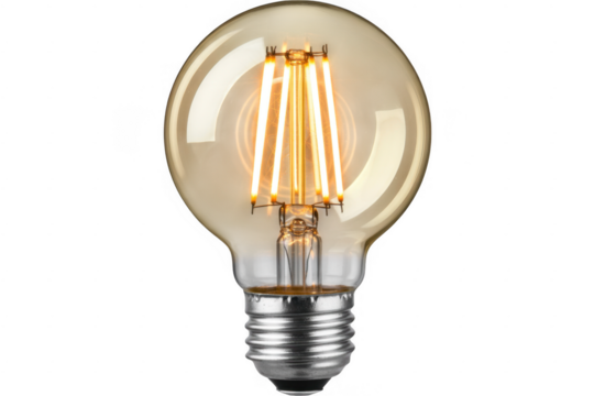 Glowing light bulb with silver base yellow glow filament isolated on a transparent background
