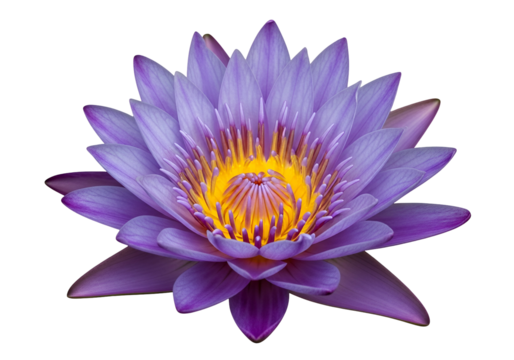 A vibrant, purple lotus flower, exquisitely detailed, blossoms against a stark black backdrop, showcasing its delicate petals and a radiant yellow center.