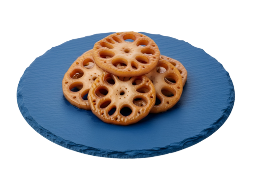 Golden-brown lotus root slices, delicately arranged on a vibrant blue plate, showcasing a rich, textured presentation against a stark black background.
