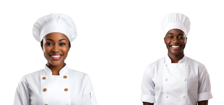 Set of Proud Afro Chefs, Cooks or Bakers: Black Man and Woman in Chef Uniform and Hat, Isolated on Transparent Background, PNG