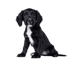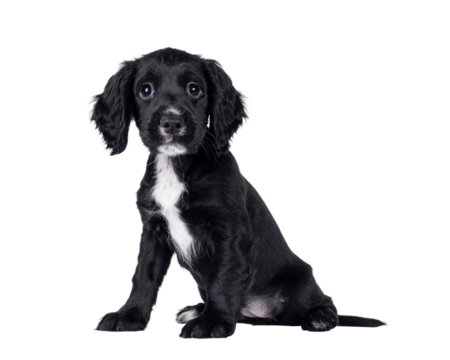 Cute English working cocker spaniel dog puppy, sitting up side ways. Looking towards camera. Isolated cutout on a transparent background.