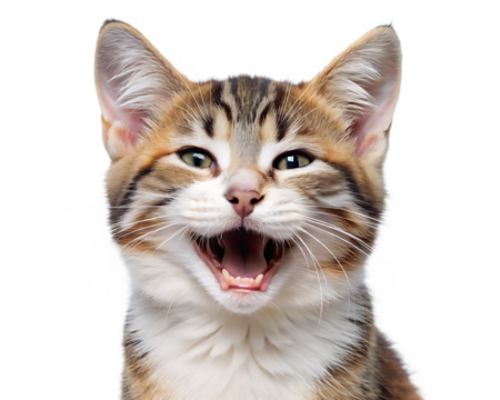 Smiling kitten portrait with open mouth and a happy facial expression on black background