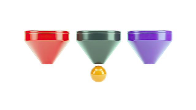 Three colorful funnels with a small orange orb