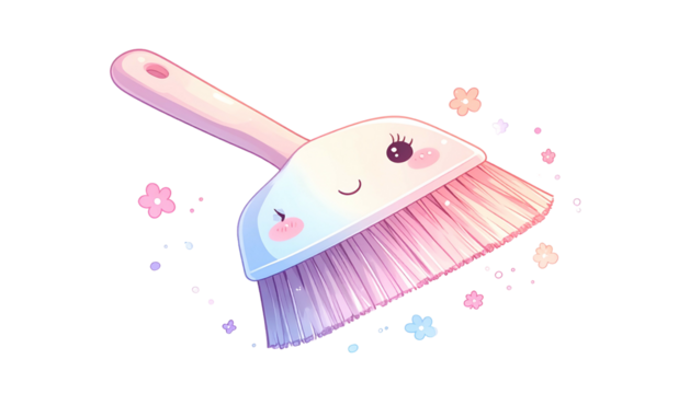 A cute animated cleaning brush with a smiling face and whimsical flower accents on a black backdrop