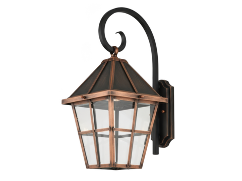 Outdoor wall lantern with a copper and black finish and clear glass panels on a transparent background