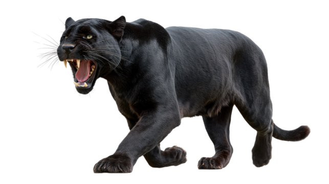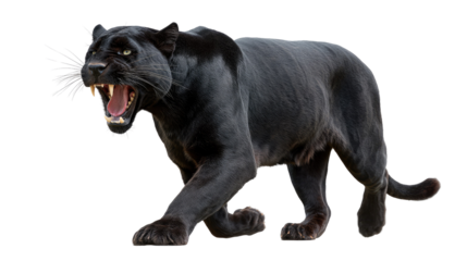 Fierce black panther roaring and displaying sharp teeth cut out on PNG. AI GENERATED.