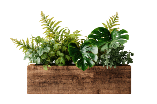 Rustic wooden planter box filled with lush green foliage against black crate, Isolated On Transparent Background, Png Cut Out