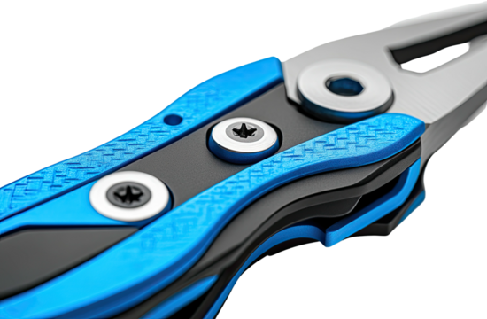 Close-up of pliers with bright blue accents on a black handle