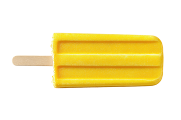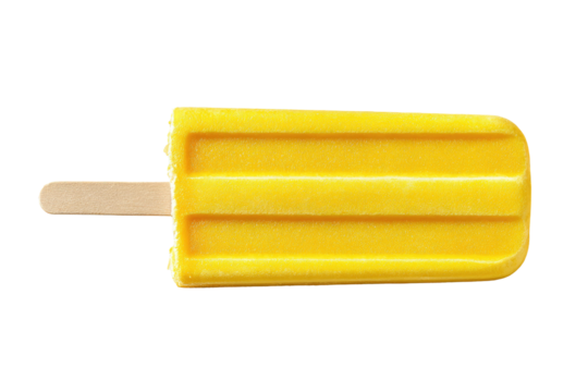 A bright yellow popsicle rests on a black backdrop, revealing the textured treat and wooden stick