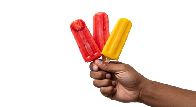 A hand holding three popsicles with red and yellow colors against a black background studio shot