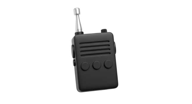 Vintage black portable radio with gold detailing and buttons, against a white background. Retro technology and communication device.