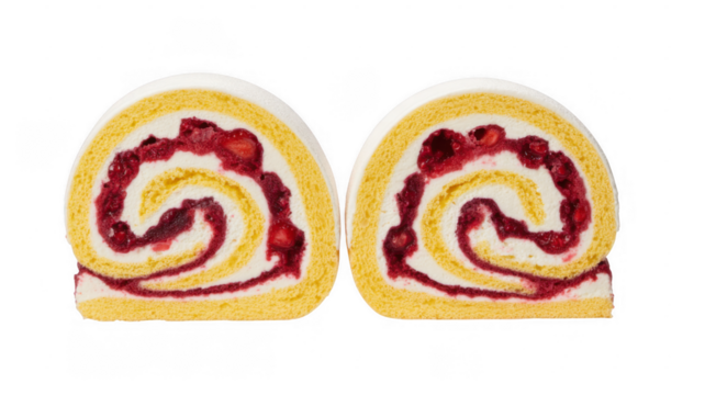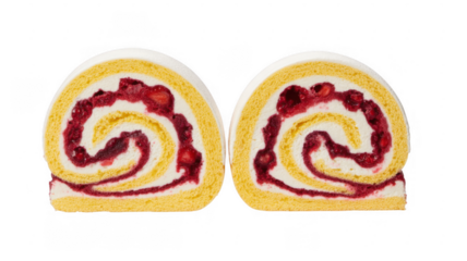 Two halves of a yellow and red cake roll on black dessert isolated on a transparent background