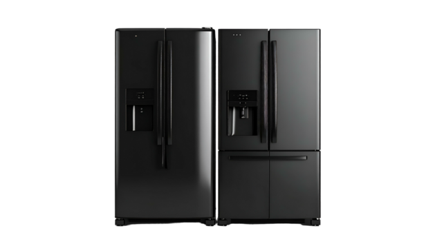 Two black refrigerators, one side-by-side and one French door, isolated on a black background