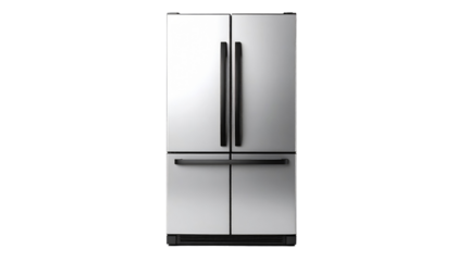 A frontal view of a modern stainless-steel four-door refrigerator with prominent black handles, set against a stark black background
