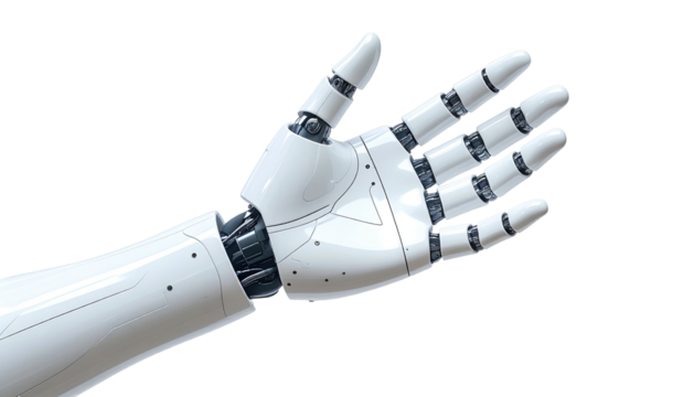 A white futuristic robotic hand and arm with glowing blue lights on a black background isolated on transparent background