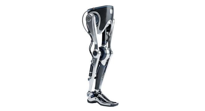 Advanced prosthetic leg, intricate and detailed design showcased against a stark black backdrop.