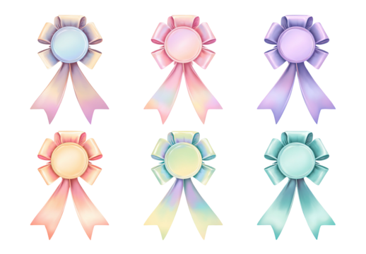 Six pastel rosettes with ribbons, each with a circular center, arranged on a black background