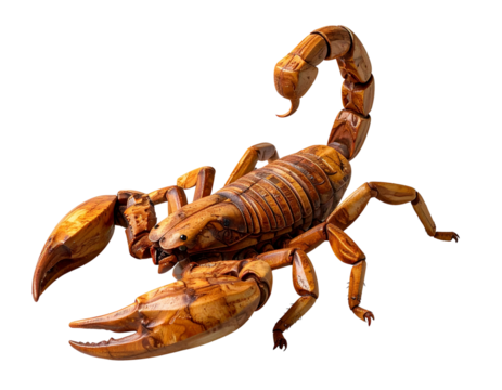 Brown scorpion with raised tail and prominent pincers, viewed from above, isolated on transparent background