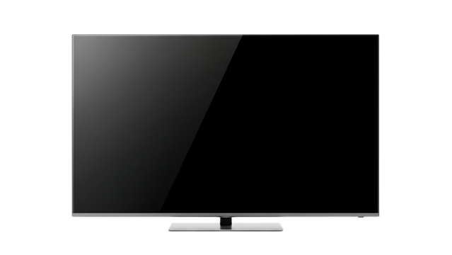 A sleek, modern smart tv with an ultra-thin black bezel and blank white screen on a grey stand, against a transparent background with copy space. Concept of digital potential