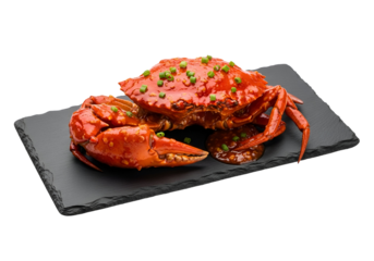 A succulent, spicy crab dish, glistening with vibrant red sauce, sits on a dark slate plate against a black background.