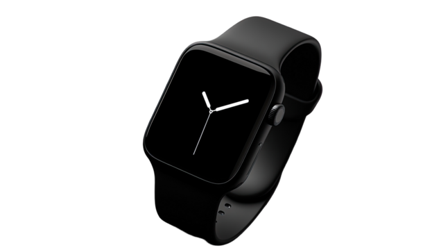 Isolated smartwatch displaying a black screen on a transparent background, ideal for showcasing apps or designs