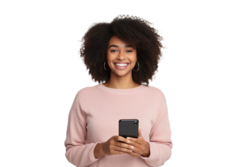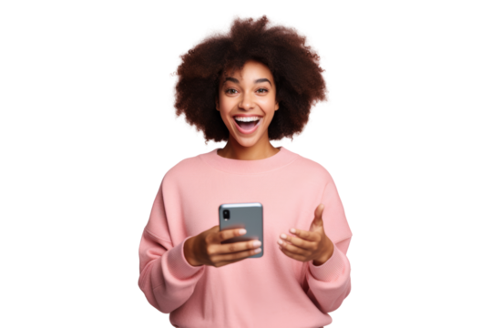 Radiant Portrait of a Joyful Young Black Woman, Grasping a Phone with a Gleeful Expression, Exquisitely Isolated Against a Pristine White Background.