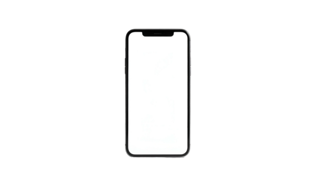 A modern smartphone with a blank white screen, perfectly centered on a stark black background