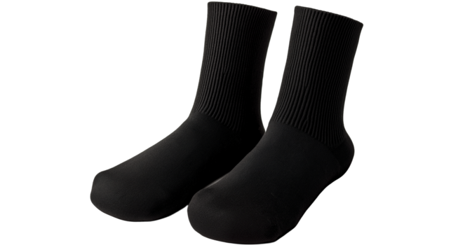 A pair of plain black socks neatly placed side by side on white background or transparent png