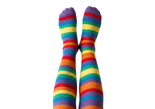 Vibrant rainbow striped socks covering legs against black studio background isolated on transparent background