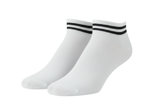 Pair of white socks with black accents isolated PNG, athletic apparel for sports and casual wear on transparent background