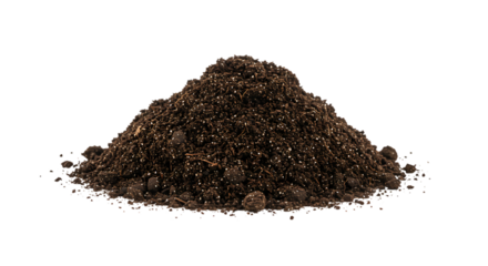 A pile of dark brown soil against a black background in a studio setting with soft lighting effects