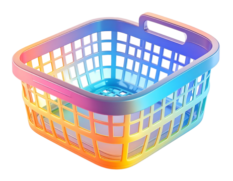 An empty, multi-colored laundry basket against a black background