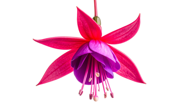 Close-up of vibrant pink and purple fuchsia flower with long stamens on a black backdrop